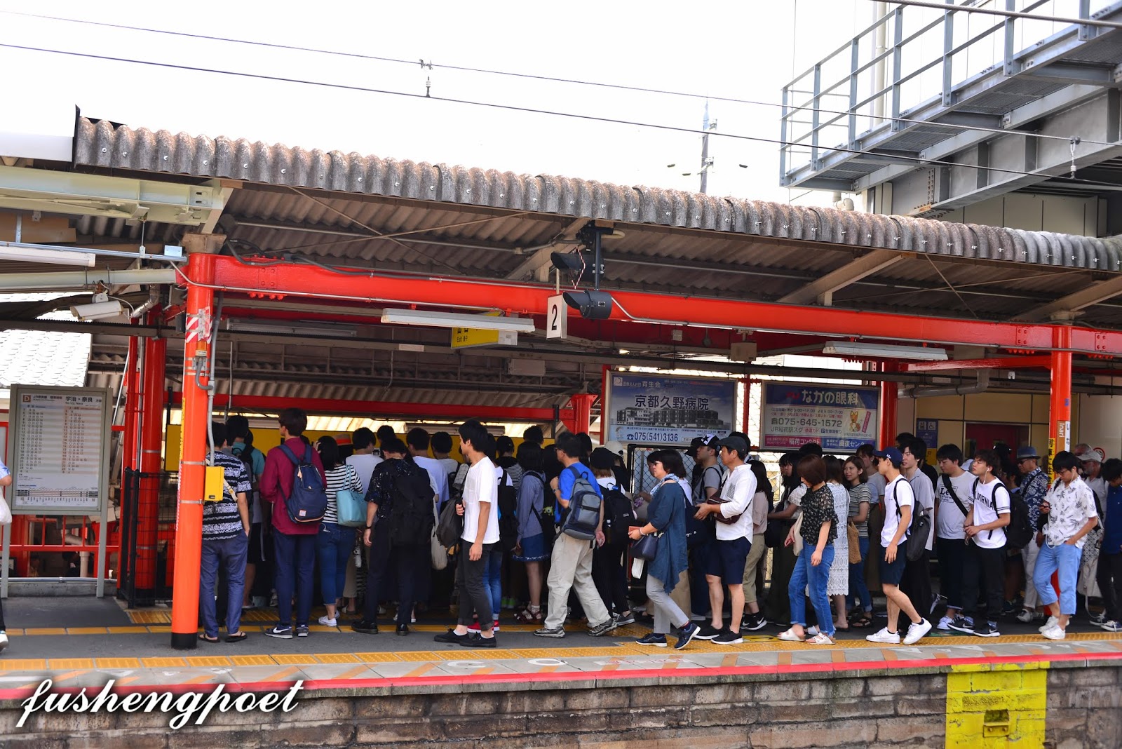 | 還好是大清早去,在稻荷車站回程時已見眾多遊客往伏見稻荷神社方向魚貫而入,我們早上來時人沒有這麼多。 | |