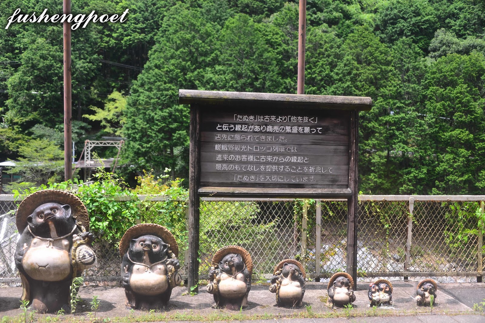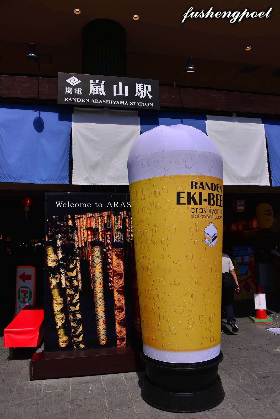 | 從竹林小徑走到復古的嵐電-嵐山駅(Randen Arashiyama station)比JR嵯峨嵐山駅(JR Saga-Arashiyama station)近7分鐘的路程。嵐電嵐山駅門口的大杯啤酒很搶鏡頭,不過應該不是永久的擺設。 | |