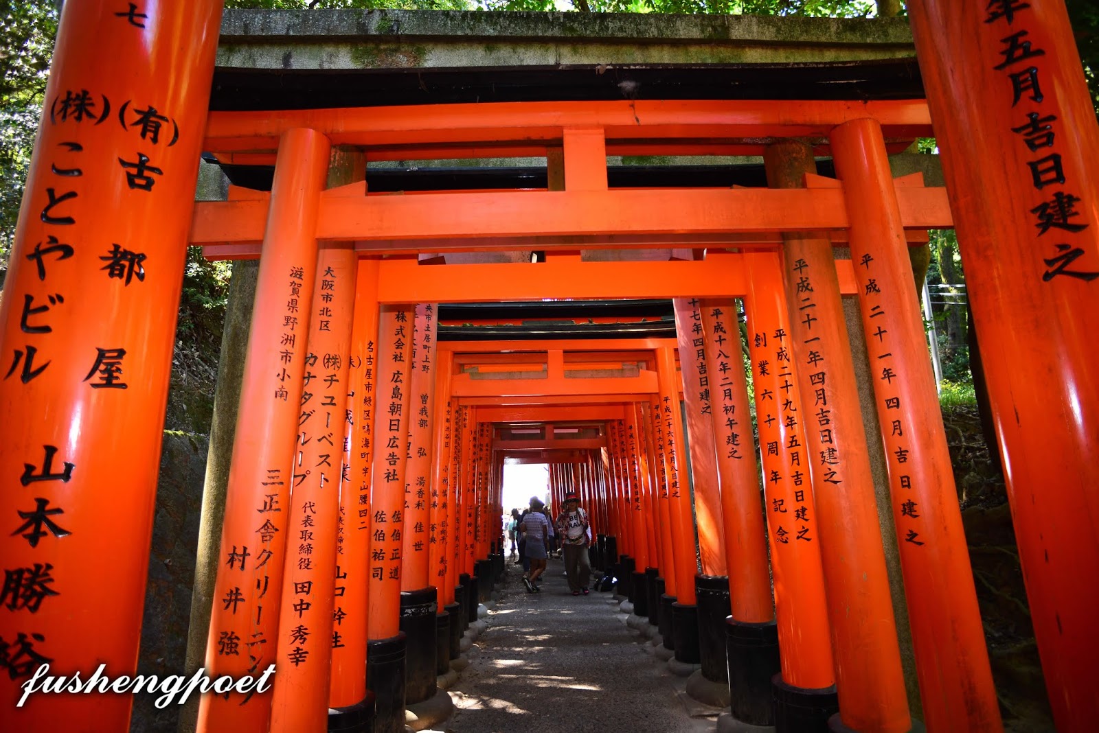 從熊鷹社折返,鳥居中央的階梯又變成平地。注意第二組鳥居有何不同? ... ... ... 答案是昭和年間所興建,而大部分的鳥居都是平成時代完成。 | |