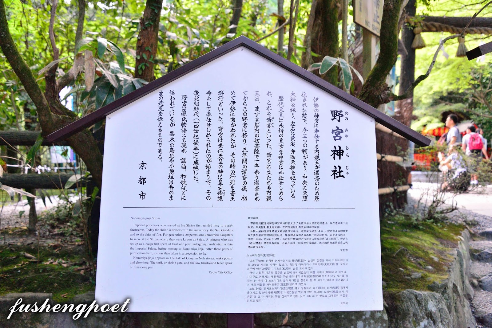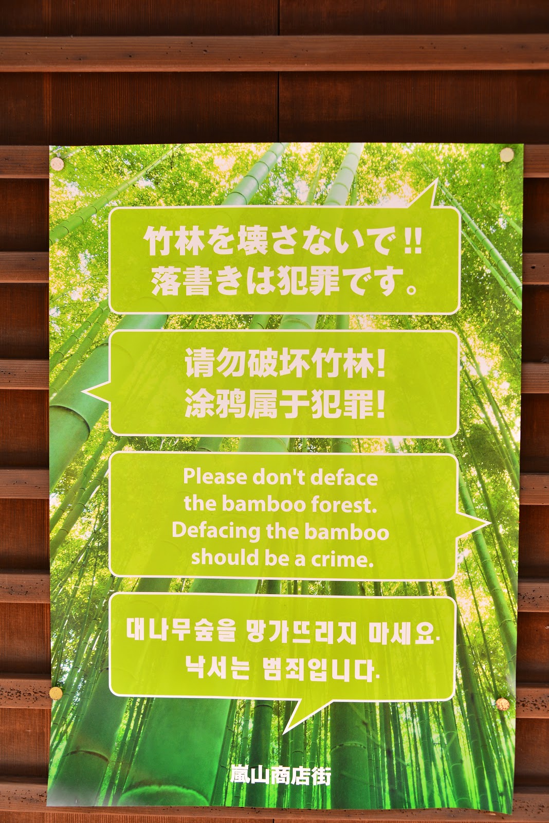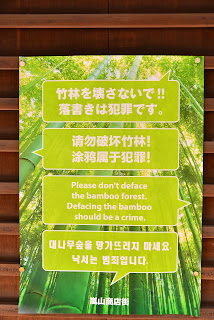 | 野宮神社對面房舍張貼了一張嚴禁「竹刻」的告示,讓我想到之前竹林小徑兩旁的枯竹圍籬,它除了限制竹林生長擴散到小徑,也保護了竹節不被觀光客所破壞。不過,動歪腦筋破壞竹林實在使人神共憤! | |