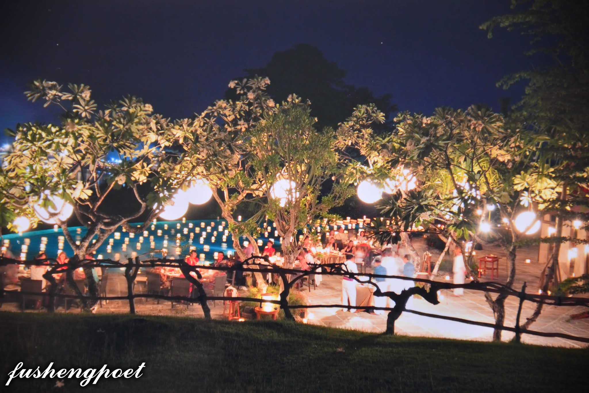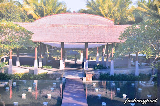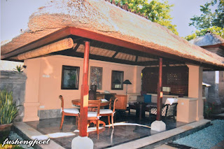 | 四季飯店在villa外也有公共餐廳(遠處),近處還有讓人休憩的茅草亭,周圍則是蓮花池。但是公共餐廳人不多,大家都寧願窩在villa「家」裡用餐。 | |