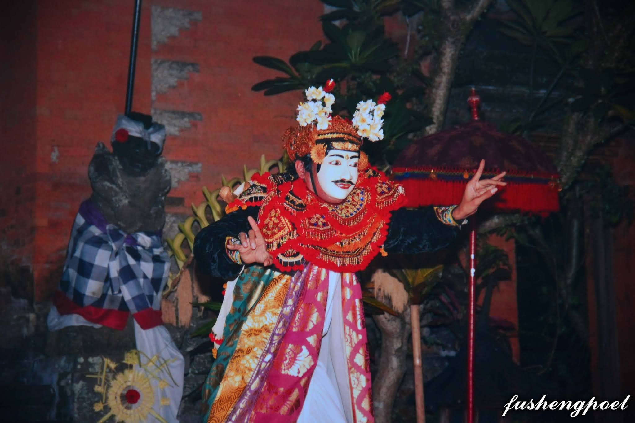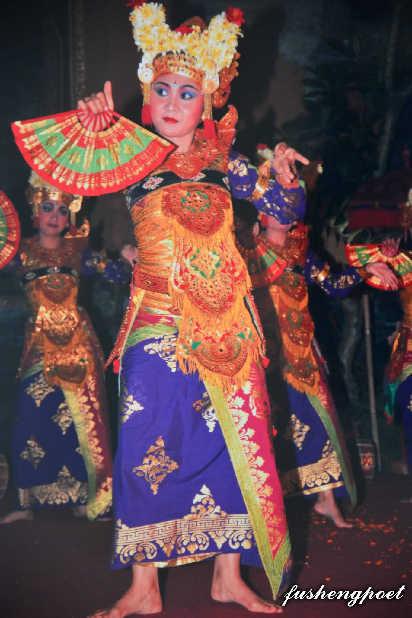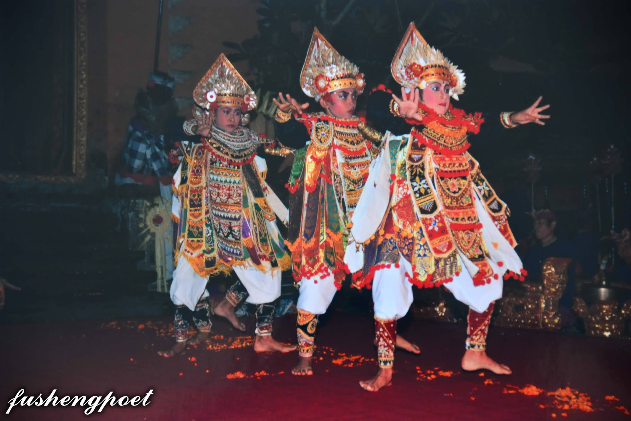 我們是在烏布皇宮(Puri Saren Agung)前欣賞夜間的雷貢舞表演,legong一詞由lega(快樂)和wong(人)兩個詞組成,將它們組合在一起,可以理解為“使人快樂的舞蹈”。 這個詞也可以分為oleg(舞蹈)和gong(加美蘭[gamelan],伴舞的傳統音樂),所以雷貢舞也是舞者在加美蘭音樂下的輕柔舞蹈。在19世紀後期雷貢舞在巴厘島宮廷裡逐漸盛行,通常會挑選未進入青春期的女子作為主要舞蹈者,他們從五歲左右開始進行嚴格的訓練,四肢、指節、眼神等等都有嚴格的要求。這些舞者在社會上享有高聲譽,常成為皇室貴族或富商的妻子,不過結婚後,他們不再跳舞。烏布王室早在20世紀初就被荷蘭人廢黜,「舊時王謝堂前燕,飛入尋常百姓家」,原來皇室獨賞的雷貢舞走入普羅大眾,未成年的舞者限制不復存在,不過這對舞蹈者經驗的累積而言,未嘗不是好事。