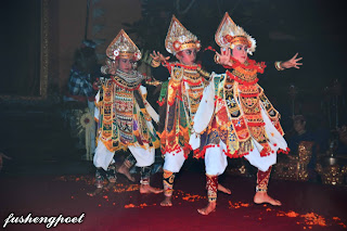 雷貢舞故事是東爪哇馬拉特(Malat)國王拉塞姆(Lasem)求愛別國的蘭格薩里(Rangkesari)公主被拒,怒戰該國國王,並囚禁逃入森林的蘭格薩里公主,公主的國王兄長聞訊前來營救,然後拉塞姆向其兄長發動總攻擊並遭遇烏鴉的襲擊而殞命。如果我的硬碟沒壞,也許可以湊出大概的故事內容,沖洗出的相片只是其中一小部分(而我又只能翻拍洗出的相片),所以要鑑別下面幾張相片的人物是故事中的那一位仍有困難。
