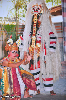 | 巴龍(Barong)舞的介紹。由左至右為宰相、皇后、被惡神獸Ronda所害之人、善神獸巴龍。登巴薩博物館。 |