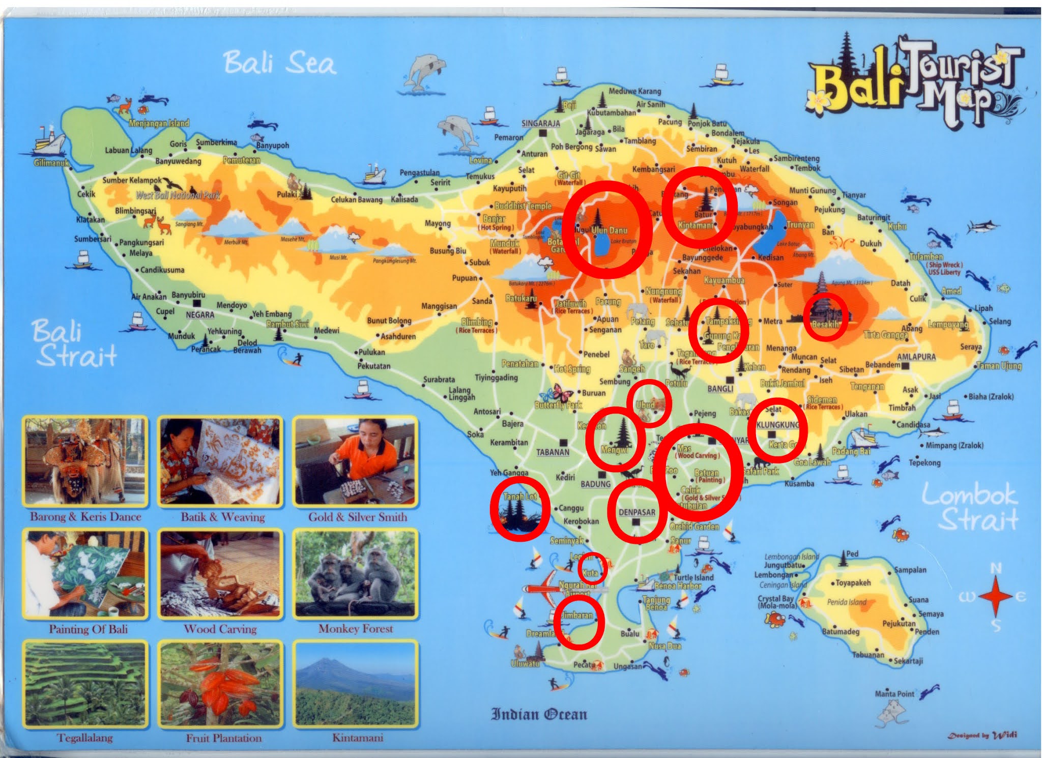 | 巴厘島旅遊地圖,紅圈處為這次貼圖涵蓋的旅行涉足點。 |