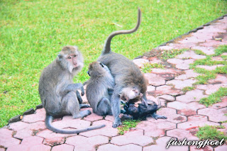 | 猴子森林裡的猴子非常主動,Paul叫我們雙手伸開上舉(如投降狀),猴子看到人手上沒東西,就會減少逼近索取食物的頻率。 | |