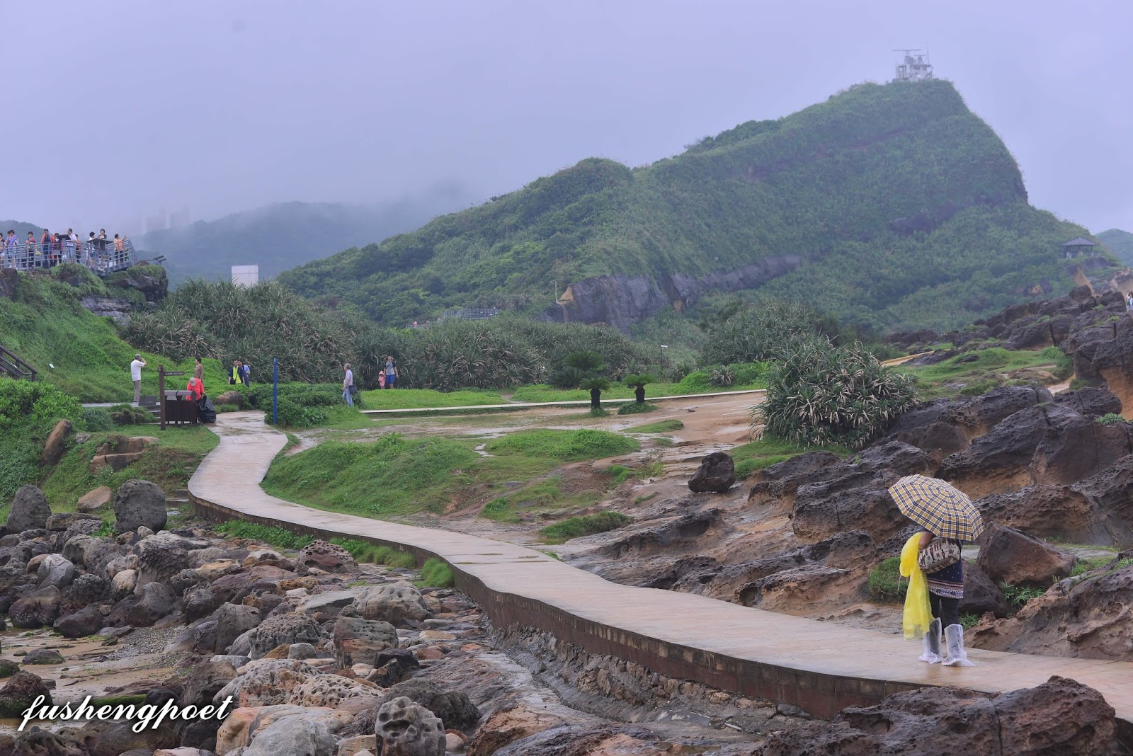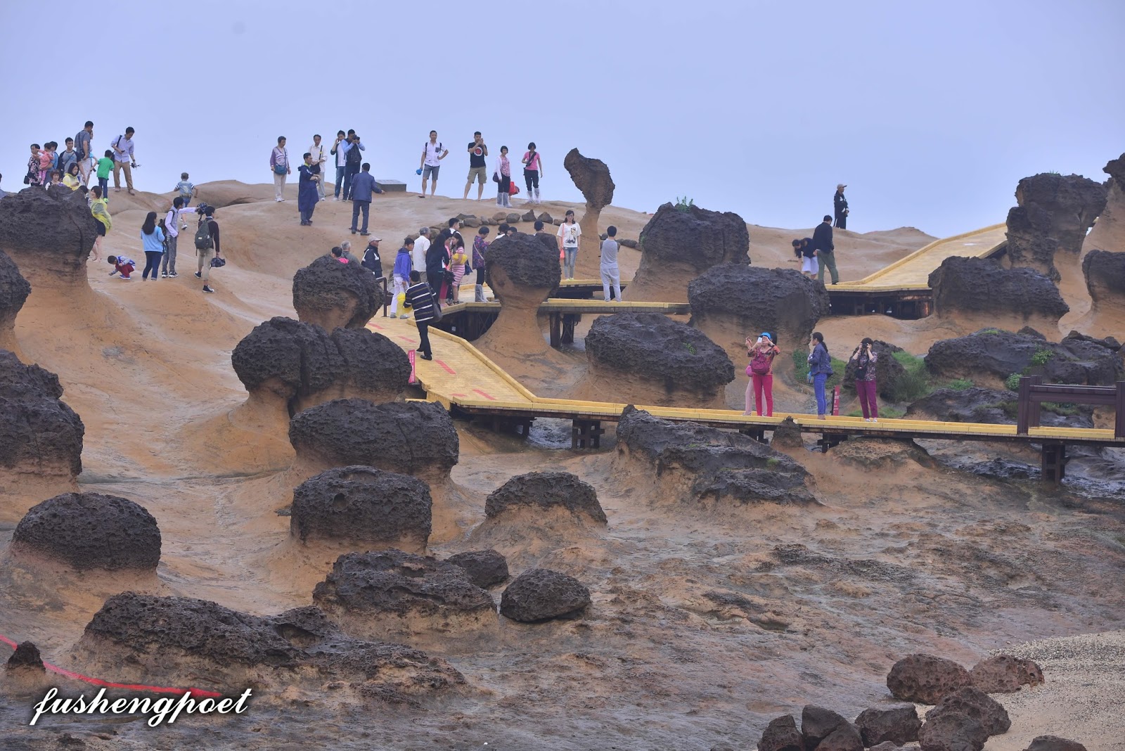 | 遊客在奇石之間的木板步道上行走。 | |