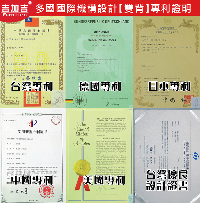 人體工學雙背設計,改善長時間座在椅子上,覺得腰部貼合度不足,有懸空或不夠沉穩的感覺,改良式的雙背背墊,除了完整包覆性外,更提供了『左右彈性』、『上下貼合』、『彈力緩衝』等特性,並有多國國際結構專利認證(台灣、德國、日本、美國、中國等),原廠專利、技術100%