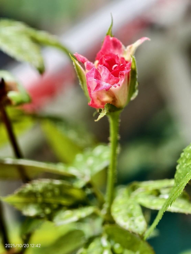 尤其在花葉間,閃爍著亮光的雨珠,更襯托出小玫瑰清麗且脫俗