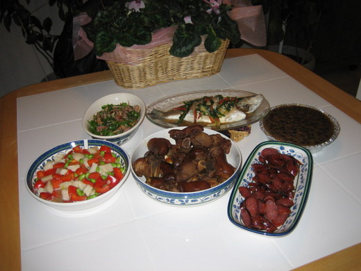 今晚年夜菜有: 清蒸鱸魚, 滷豬腳, 煎台灣香腸, 新鮮干貝炒紅椒毛豆, 燻鵝腿拌香菜. 另外我也買了紅豆年糕及蘿蔔糕 . 本來想炒米粉及煮花枝丸湯, 但是馬修這幾天發燒感冒, 很黏我 ,所以沒那麼多時間煮. 只有煮飯 (用電鍋煮). 另一原因則是,麥克只喜歡吃台灣香腸而以, 其他都我包辦. 我不想煮太多菜, 而造成幾天後我都一直吃剩菜 .