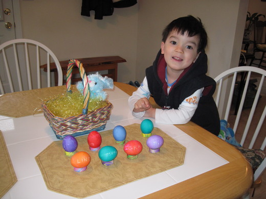 裝飾完Easter Eggs後, 馬上要求egg hunting...(尋找蛋). 還好前1晚我已經將蛋都藏好了, 所以就拿了個籃子給他去找蛋. 5分鐘後,15個彩蛋都找到了, 他要求再玩一次, 所以我要他閉上眼睛, 我藏好後, 他又玩一次找蛋, 之後他就心滿意足的坐在他的小搖椅上, 吃起chocolate eggs, M&M巧克力(裝在塑膠蛋理Chocolate eggs)及Jelly beans.