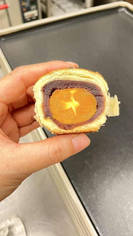 晴天菓子的蛋黃酥有一個讓人無法抗拒的酥脆外皮,咬下去的瞬間,那層層酥鬆的口感就像是味蕾在跳舞,而裡面的紅豆沙餡則是綿密得讓人滿足。最讓人驚艷的,是那鹹香的蛋黃,完美地和紅豆沙融合在一起,讓整個蛋黃酥充滿層次感。這一切都要歸功於灑上的法國鹽之花,為整體口感增添了鹹香的豐富層次。