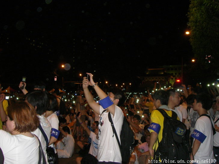 人數看起來換算五小時應有七萬人以上,因為活動從晚上五點才開始,避開太陽,我去看時是最高峰,等到公園聚會結束,十點多換從公園路走到凱道,還是大多數是年輕人擠滿凱道,所以最後拿手機出來默哀,人人智慧型手機高高舉起,現在年輕人真是有錢哪。