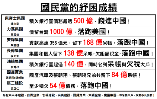 高志鵬委員質疑,馬英九所謂「十年前的經驗」,是什麼樣的經驗?若檢視國民黨過去的紓困成績,最豐富的恐怕是掏空國庫的經驗。過去國民黨所執行的紓困,造就了陳由豪、王又曾、朱安雄、楊天生、曾正仁…等呆帳大戶,這些幾乎都是和國民黨友好的企業主,在十年前的金融風暴中,獲得國民黨政府給予紓困,但如今不少人都落跑到中國,是標準的「債留台灣,錢進中國」。