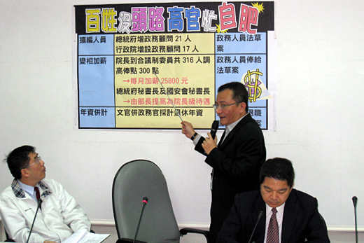 高志鵬說,「政務人員法草案」讓總統府增設政務顧問21人,行政院增設政務顧問17人;「政務人員俸給法草案」則是從院長到合議制委員都調高俸點,中央高官316人都加薪,其中部長俸點上調300點,以1點新台幣86元計算,等於每月變相加薪2萬5800元。另外,總統府秘書長詹春柏及國安會秘書長蘇起,由部長級薪水提高為院長級待遇。 另外,他說,「政務人員退職撫卹修正草案」則是讓文官併政務官採計退休年資,現行是文官、政務官退休年資分開採計,此法若修正,有利現任政務人員領月退休金條件,民進黨政府過去修法討論此案時,國民黨也主張政務官、事務官年資不能合計。