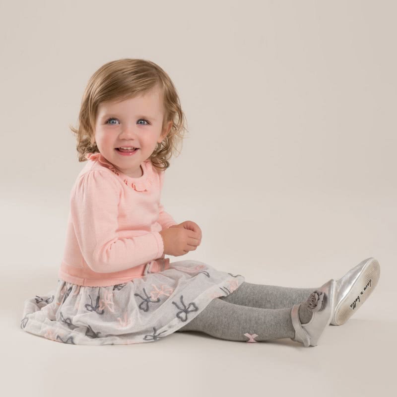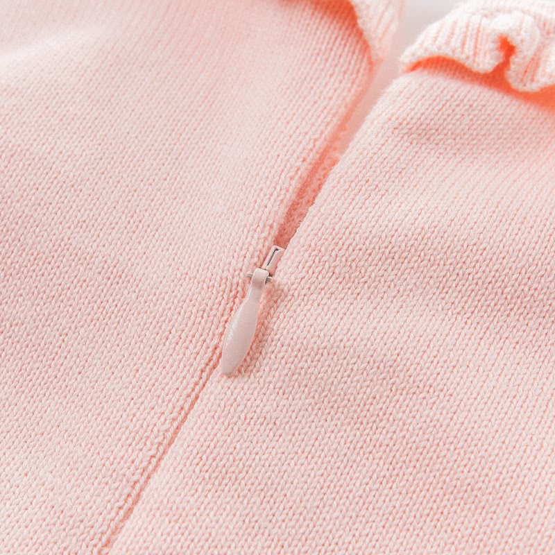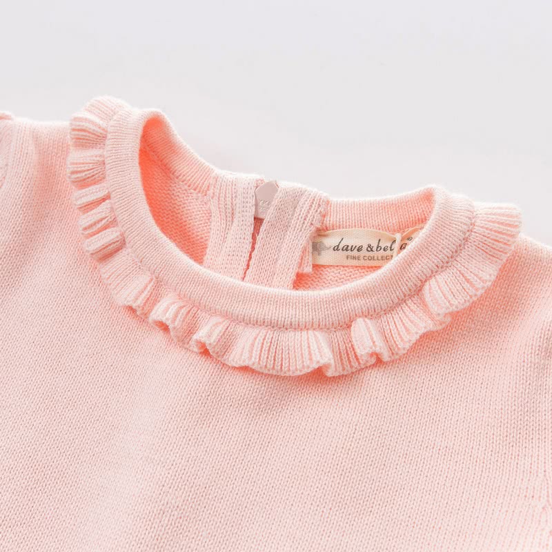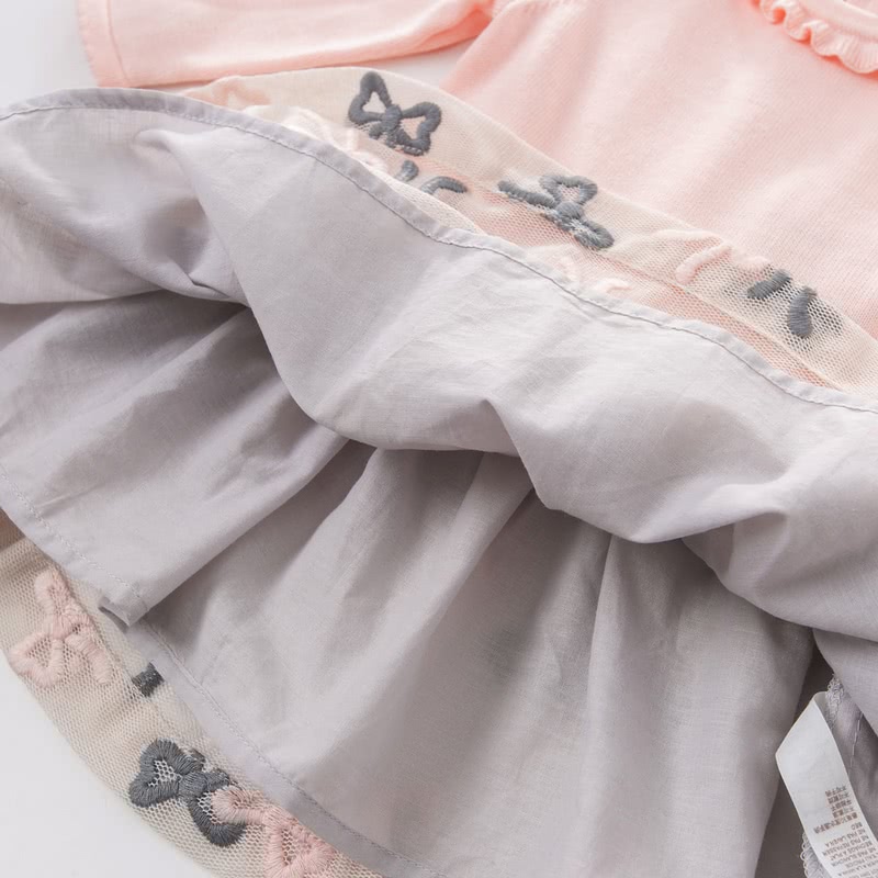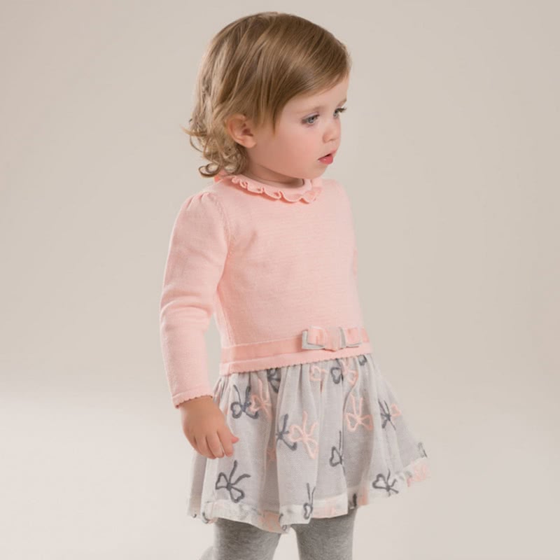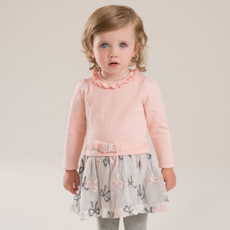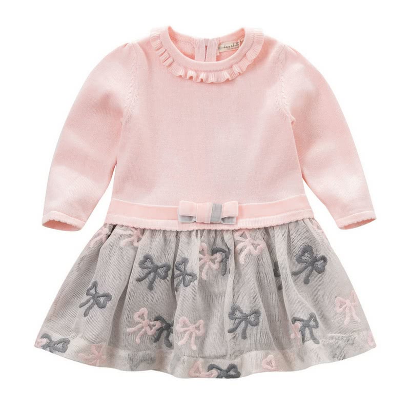 【Dave Bella】長袖針織洋裝 - 粉底雙色蝶結網紗(DB3908)