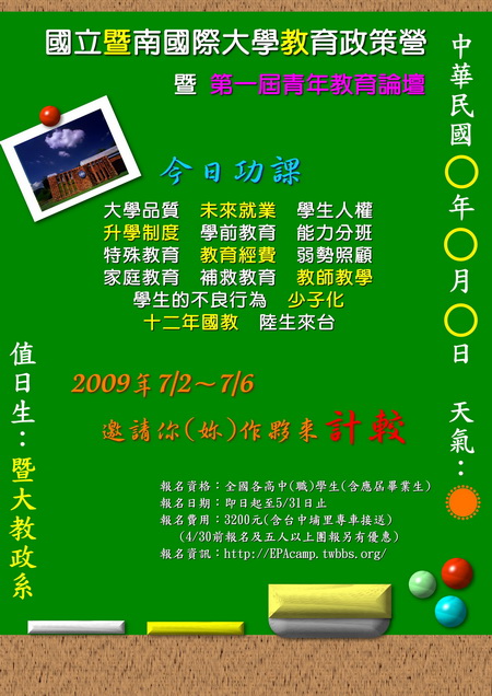 國立暨南國際大學教育政策與行政學系為了讓高中職學生瞭解國內外教育時事脈動、理論基礎、體驗大學教育的學習氛圍,因此擇定