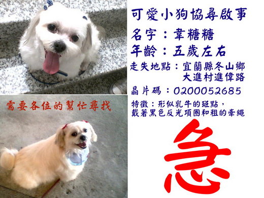 小狗的名字叫做韋糖糖,是一隻已經結紮的公狗,樣貌相當惹人憐愛,晶片碼為0200052685,年紀約莫5歲多,體重