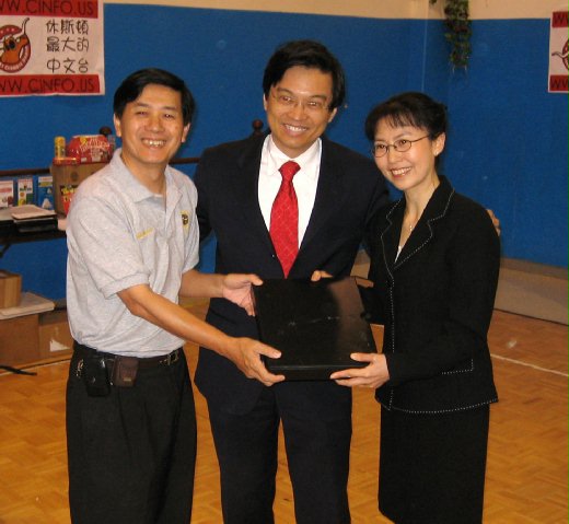 福遍地區最大的華人社團『僑灣社』於上週六 (4月26日)舉行社長交接典禮,由馮淑璽、常中政分別接任2008年社長及副社長,劉莉玲接任財務。在糖城市議員黃安祥(圖中)的監交下,前任社長劉志恆(圖左一)將一本厚重的德州法人團體登記冊交給馮淑璽(圖右一),她笑稱『接下這本厚重的書,肩上的責任更加沉重了!』