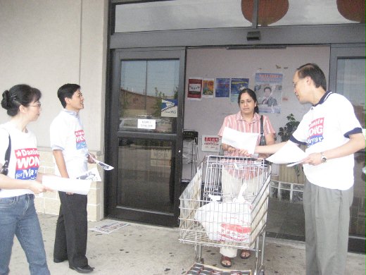下圖二:僑灣社成員到商場發放傳單,為市長候選人黃安祥作最後的催票活動。