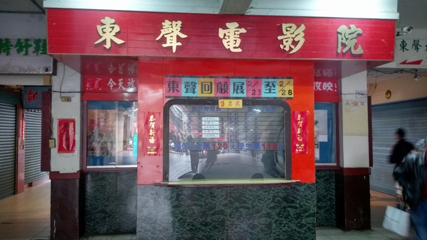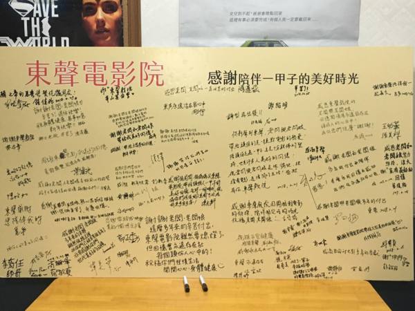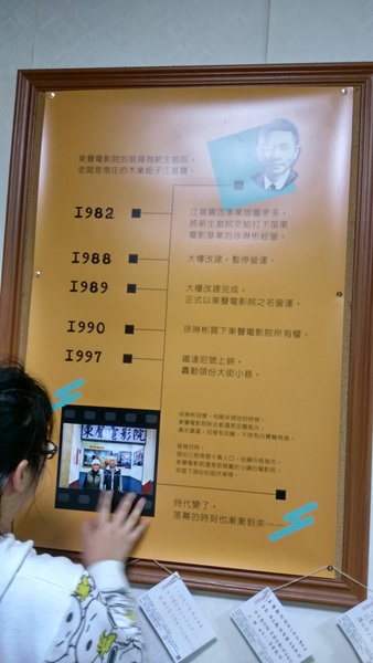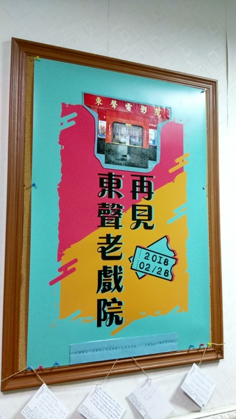 在戲院結束營業的當天,於戲院播映最後一場電影前一場,頭份市公所有在戲院辦了一場在地回顧展。現場有播映頭份地區老產業的影片,而在戲院大廳也貼了許多關於東聲戲院的介紹。包括徐老闆的故事以及東聲戲院的小資料。現場來的人數比上一場來的人更多。大家都擠在廊道上面拍照。我想,這樣的盛景應該只有在戲院剛開始營業時才會有的盛況吧?假如每天都有很多人來... 戲院也就不會結束營業了呀。臺灣人很愛珍惜最後一夜,但反而平時就沒有太多關注。不過至少有許多人來,相信戲院的徐老闆夫婦他們也是很感動的。