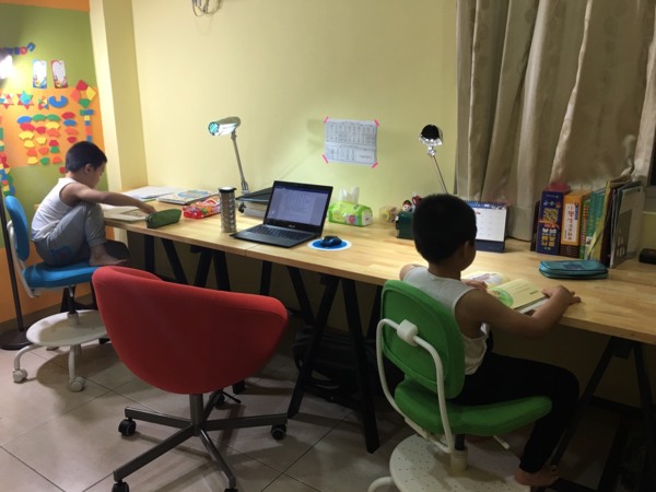傻老媽向來不喜歡繁雜的購物行程,早就在網路上挑選好喜歡的桌椅型號,當場確認品質無誤後立刻結帳並安排宅配安裝,再花兩天上了兩層木蠟油加以防護後就完成彬彬昇昇未來數年的學習平台。