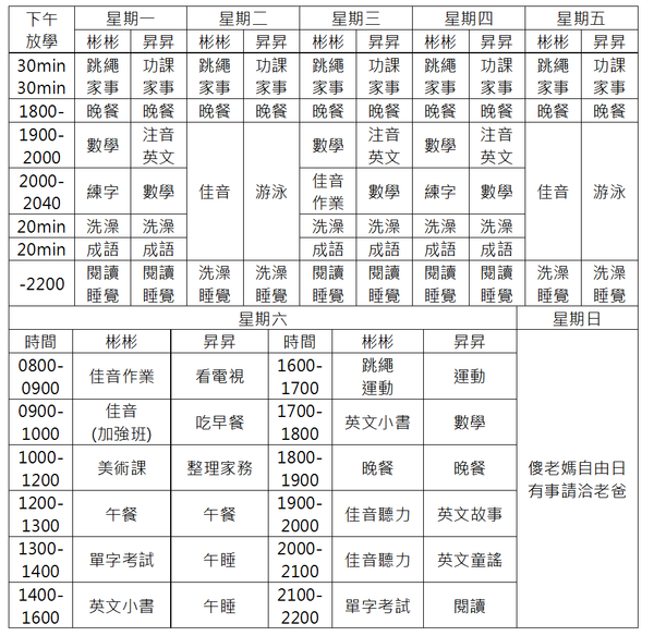 *本表張貼書桌前方,讓彬彬昇昇學習掌握時間與活動安排。