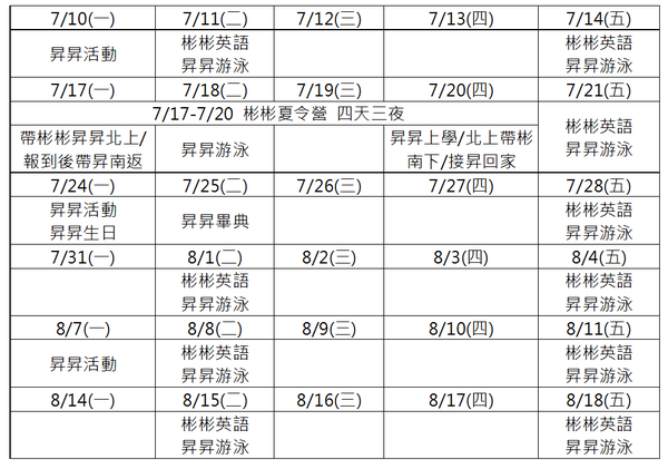傻老媽此刻也不能再裝傻,只好拿出虎媽本色,列出「活動行事曆」以及「工作時程表」讓一家"三口"照表操課,才不會被兒子們暑假繁雜的活動混淆,也不至於因為一打二而浪費了晚上原本固定一對一分工的學習時間……