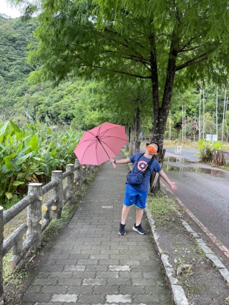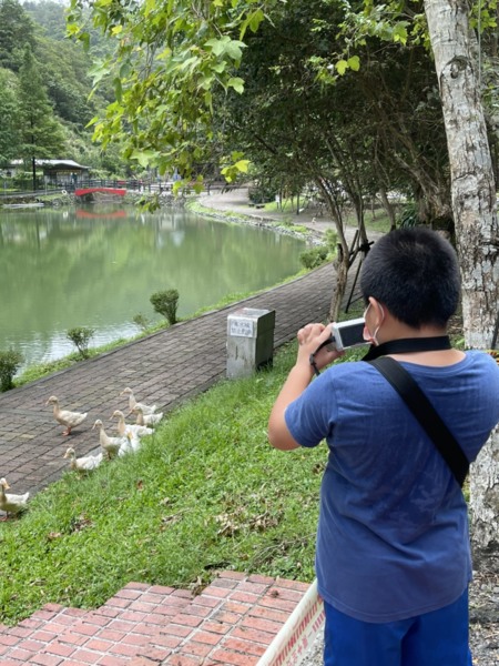 退房後,國文媽帶著小六彬去優美的「望龍埤步道」,雖然環水步道都被封條圍著無法進入湖中的曲橋涼亭,但是走在步道外側依然可以感受到這美麗的湖光山色,母子撐著傘愜意散步聊天,也別有一番樂趣。此時,遠方呱呱呱地走來一群鴨子,不怕生地乖巧停在小六彬跟前,該是太久沒有遊客來餵食,所以開心地率隊過來索討吧。