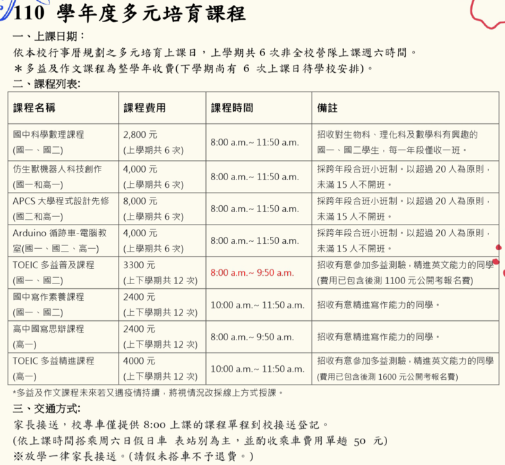 1.隔週全校營隊,06:10-14:45。(上學時間與平日相同)