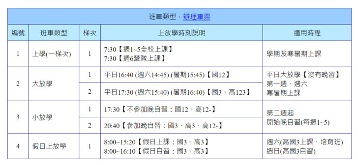私校的上課時數比公立學校長~~~很多,第八節只是基本、第九節不過是客套、週末班更是主力放送,所以私校生"根本"沒有週六可言。(下方圖片是複雜的〈上放學時程表〉,國文媽至今還沒搞懂,可能必須等國一彬身體力行、順順流程之後才能明白……)