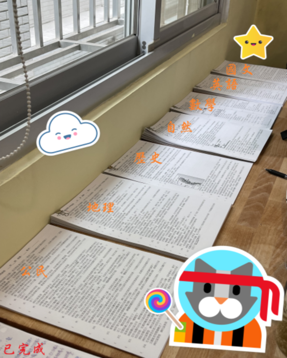 "刷題"是國文媽與國一彬最近才開始著手進行的工作。在第二次段考以前,國一彬基本上都跟著學校購買的講義練習,唯一特別的,是國文媽會從手邊資源中選取"困難題型"加強重要觀念。只是,困難題數量不多,涵蓋度也稍嫌狹隘,國文媽漸漸發覺國一彬會抱怨文科題目太多,寫完後沒時間檢查;也很常在簡單觀念出錯或數學題目卡住……,母子倆仔細討論癥結點與思考解決方案後,決定"增加練習題目數量"!(前提是,孩子也願意接受這樣的訓練喔!)。於是,國文媽開始蒐集各科各章節題目,每日每日督促國一彬加快書寫速度,這樣有兩個好處:第一,是擴充知識的廣度,練習題數增加後,各種題型大量出現,更能掌握課本觀念能有哪些實際出題角度與方向。第二,是提高更快更直觀的作答時效,不論是文科題目或是數學題目,大量的練習會加快"讀懂"題目的適應時間,計算過程也因為手寫訓練的增加而提高正確率,整體來說效益非常好。