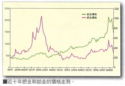 圖表: 1998-2008年9月,十年間鈀金和鉑金的年平均價格走勢。