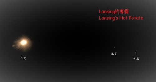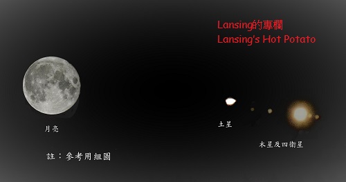 四、土星的光環傾斜度每年不同,今年的,左低右高呈約30度角。天氣好的時候,用望遠鏡可以看到。