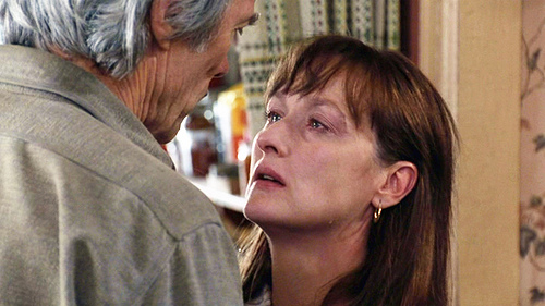 而和許多人的看法一樣,本片中最令我印象深刻的一幕,就是當法蘭琪絲卡和李察外出購物時,尚在城鎮上的勞勃站在磅礡大雨中、企圖讓法蘭琪絲卡改變心意,而當他將卡車開到紅綠燈前的路口、將法蘭琪絲卡的項鍊掛在後照鏡上時,法蘭琪絲卡將手放在車門把手上的掙扎,將全片的情感張力烘托到最高峰,這絕對要歸功於史翠普一向出神入化的精湛演技,將那份內心衝突詮釋得極致感人,雖然她順利入圍該屆的奧斯卡最佳女主角,卻相當可惜並未因這個我心目中的最佳演出再登后座。