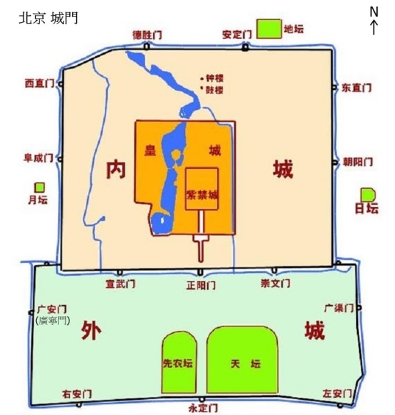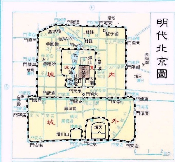 這條中軸線始於元朝,至明清兩朝形成了現有的規模.明清時的北京城,皇宮居全城中心,受三重城垣包圍,皇城是朝廷重地,禁止一般百姓進入;內城居住著官僚和商人;外城(永定門~正陽門,廣渠門~廣寧門)為一般平民居住.
