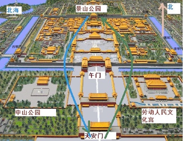 北京城的中軸線世界上唯一的建築藝術軸線,始建於1272年.全長7.86公里,南起永定門北至鐘鼓樓.至元九年,元世祖忽必烈營造大都時起,嘉靖三十二年加修外城後,南端延長至永定門.清沿明制,然後民國、新中國至今740多年.