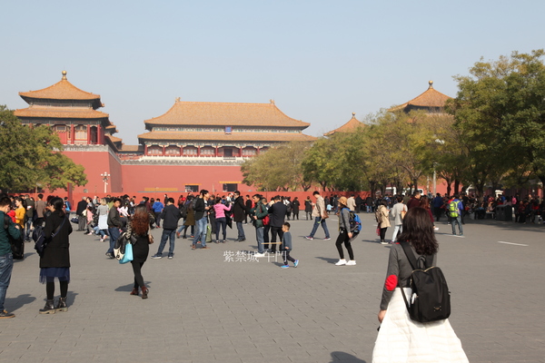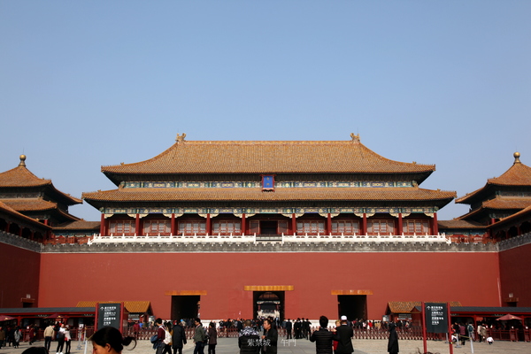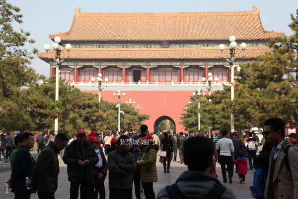看到天安門上黃琉璃瓦,紅柱子,紅墻身,前面是白色的金水橋,白色的華表,白色的石獅子.走過金水橋、天安門後,又見到一座和天安門一模一樣的建築——端門.走過端門、穿過端門廣場,看到的是午門.午門城墻兩面伸出來,像個巨人伸出雙手,歡迎使者.在高大的城墻面前,人顯得很渺小.午門上有吹號的迎賓隊伍,午門前有一個鐘樓,一個鼓樓,鐘鼓齊鳴.