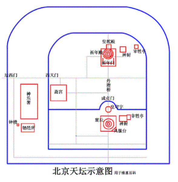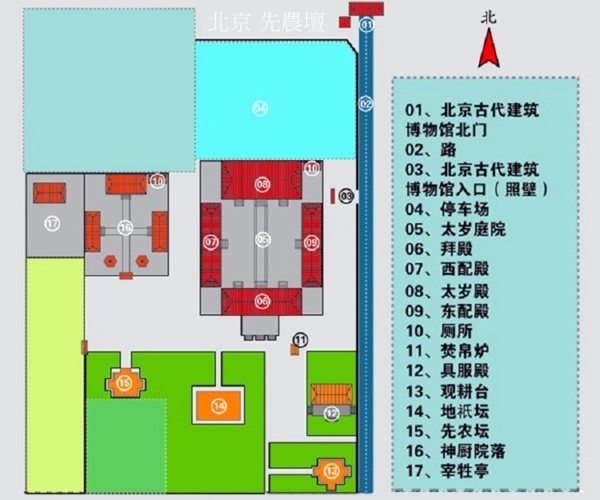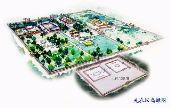 按照傳統的“隆廟社、崇闕壇”規制,在中軸線兩旁對稱排列各種壇廟建築物,排序為;先農壇’天壇等.