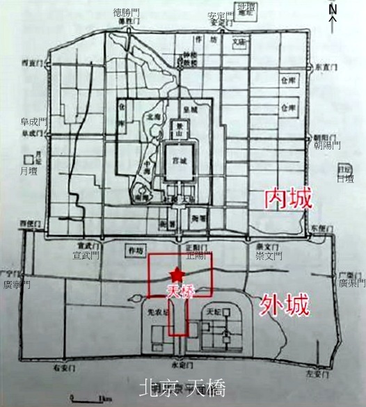 嘉靖三十二年,修建外郭城時把天橋攔進永定門,形成了近代天橋地區的雛形,南到天壇,北至珠市口,東邊到金魚池,西邊到虎坊橋.清沿明制,除了抽空到南海子去狩個獵,體會一番祖先騎射生涯,照樣不管天橋.而且清代實行旗民分治,大量的漢人遷出內城.正陽門外到永定門內,濕地逐漸改成民居.儘管那時候還是用“天橋南北,地最宏敞”形容,但是,因為人口劇增,野趣盡失,五方雜陳,各色人等,成為老百姓口中的雜巴地,保留下來的是街頭的各種演藝和與臨時集市.