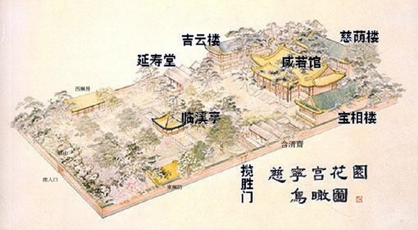 花園南北長約130m,東西寬50m,總占地面積6800㎡.園中僅有建築11座,占地不到總面積的五分之一,集中於花園北部,南部則地勢平坦開闊,蒔花種樹,疊石壘池,意在使太后、太妃嬪們不費跋涉之勞而得山林之趣.