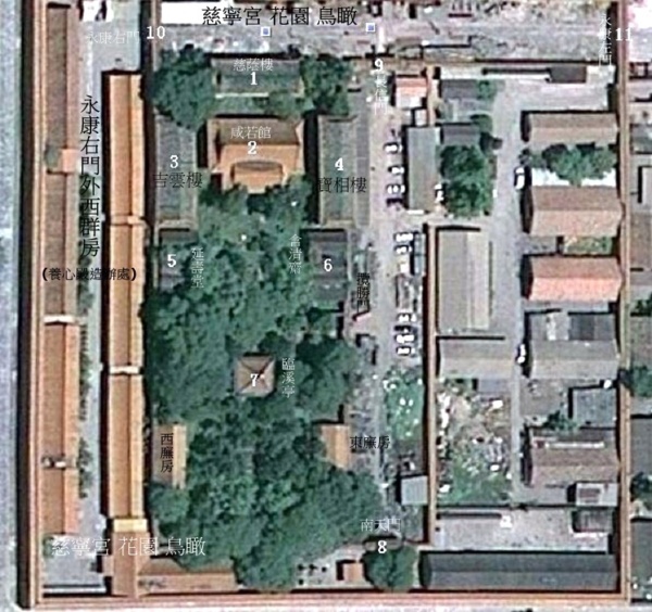 花園入口攬勝門設在東牆,為一樸素的隨牆門.東院考古進行,隔欄有”明”建材’溝渠出土.進門北望,主殿為咸若館,面闊5間,前出抱廈,黃琉璃瓦頂.館前有花壇一座,東西兩側有寶相樓和吉雲樓,館後正北為慈蔭樓.三座樓形制相近,皆為兩層,覆綠琉璃瓦黃剪邊卷棚歇山頂,成“凵”形環抱咸若館.慈蔭樓底層東梢間開一小門,與慈寧宮前廣場相通.寶相樓和吉雲樓正南各有小院一座,名為含清齋、延壽堂,是乾隆皇帝侍奉皇太后湯藥之處,亦為苫次(ㄕㄢ 次;居親喪的地方)之所.院中主體建築為灰瓦三卷勾連搭卷棚頂,素雅新穎.