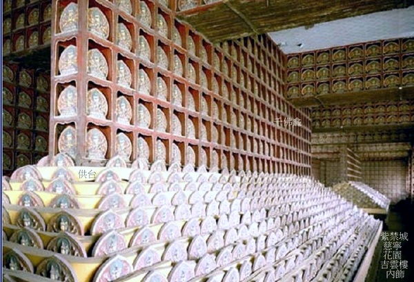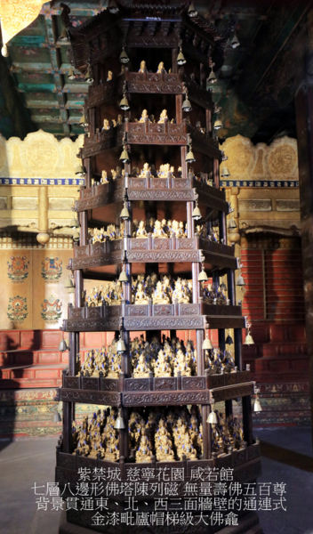 樓上下室內正中均供有大尊佛像.佛像兩側各有一個長方形底座及多層臺階的金字塔式供台,供台頂部是一道長牆式的千佛龕.供臺上層層擺放五彩描金擦擦佛母像.四壁、屋樑各處滿做千佛龕,內供相同的五彩描金擦擦佛母像,共計一萬餘尊,是為宮內一處名副其實的萬佛樓.這種專供擦擦佛的寬敞殿堂可能是內地藏傳佛殿中僅存者,西藏亦未見有實例,故為極其珍貴的佛教遺跡.