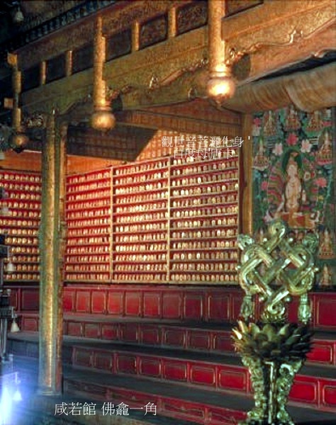 樓上明間原供木雕金漆宗喀巴像,三面牆壁掛釋迦畫傳、宗喀巴畫傳唐卡.其餘6間正面設供案,供顯、密主尊像,每室9尊,共54尊,與樓下6室所供54尊護法神像相對應;兩側面設壁嵌式千佛龕,每間供小銅像122尊,6室共計732尊;千佛龕下為壁隔式紫檀木經櫃,藏貯各種佛經.