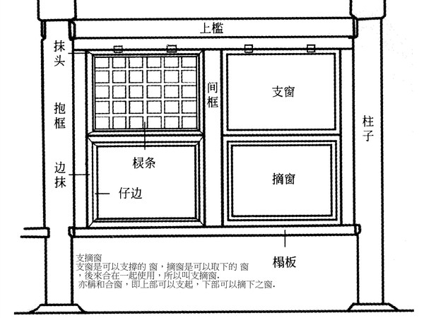 支窗是可以支撐的 窗,摘窗是可以取下的 窗,後來合在一起使用,所以叫支摘窗. 亦稱和合窗,即上部可以支起,下部可以摘下之窗.