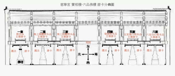 寶相樓除明間外,其餘6室依顯宗、密宗、事部、行部、瑜伽部、無上瑜伽部父續、無上瑜伽部母續分別配供佛像、唐卡、供器,集顯宗、密宗為一體,體現了藏傳佛教格魯派顯密兼修的修持特色,成為清宮佛堂的一種重要模式,清宮檔案中稱之為“六品佛樓”.