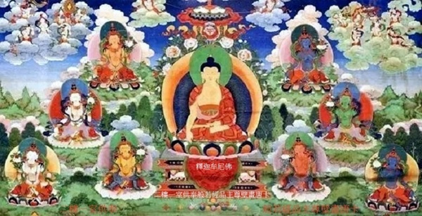釋迦牟尼佛右手結觸地印,左手結禪定印,結跏趺坐於蓮花獅子座上.兩側分列八大菩薩,即文殊菩薩、觀世音菩薩、金剛手菩薩、普賢菩薩、地藏菩薩、彌勒菩薩、除蓋障菩薩、虛空藏菩薩,空中繪有供奉天女.