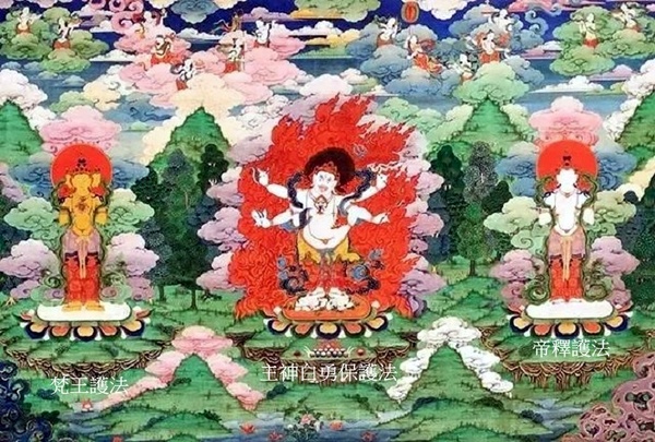 中間為主神白勇保護法,也稱大黑護法如意寶、大寶如意護法,白色身,一頭六臂憤怒相;左側為梵王,四面,黃色身,菩薩裝雙手捧法輪;右側為帝釋,一面二臂白色身,菩薩裝,雙手捧白海螺.