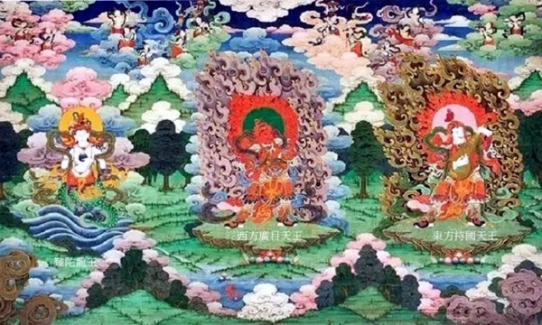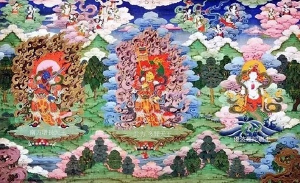 中間為北方多聞天王,手持寶幢和吐寶鼬;左側為南方增長天王,藍色身,手持寶劍;右側優波難陀龍王,白色身,一面二臂,頭頂七蛇,人身龍尾,從海中升起.