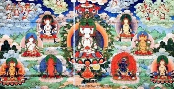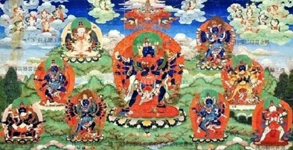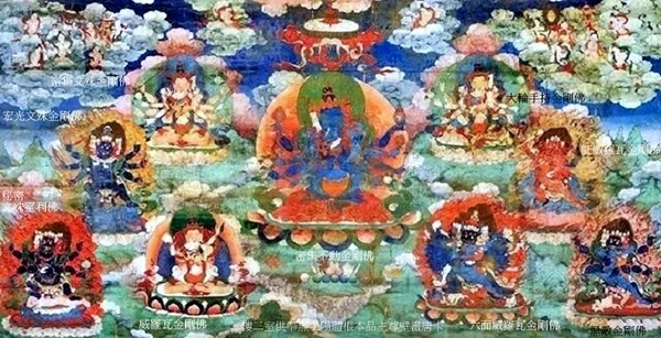 正中 上樂王佛 藍色身,懷抱佛母,周圍分別是白上樂王佛、持嘎巴拉喜金剛、持兵器喜金剛、大幻金剛佛、、佛陀嘎巴拉佛、時輪王佛、瑜伽虛空佛、佛海觀世音佛.